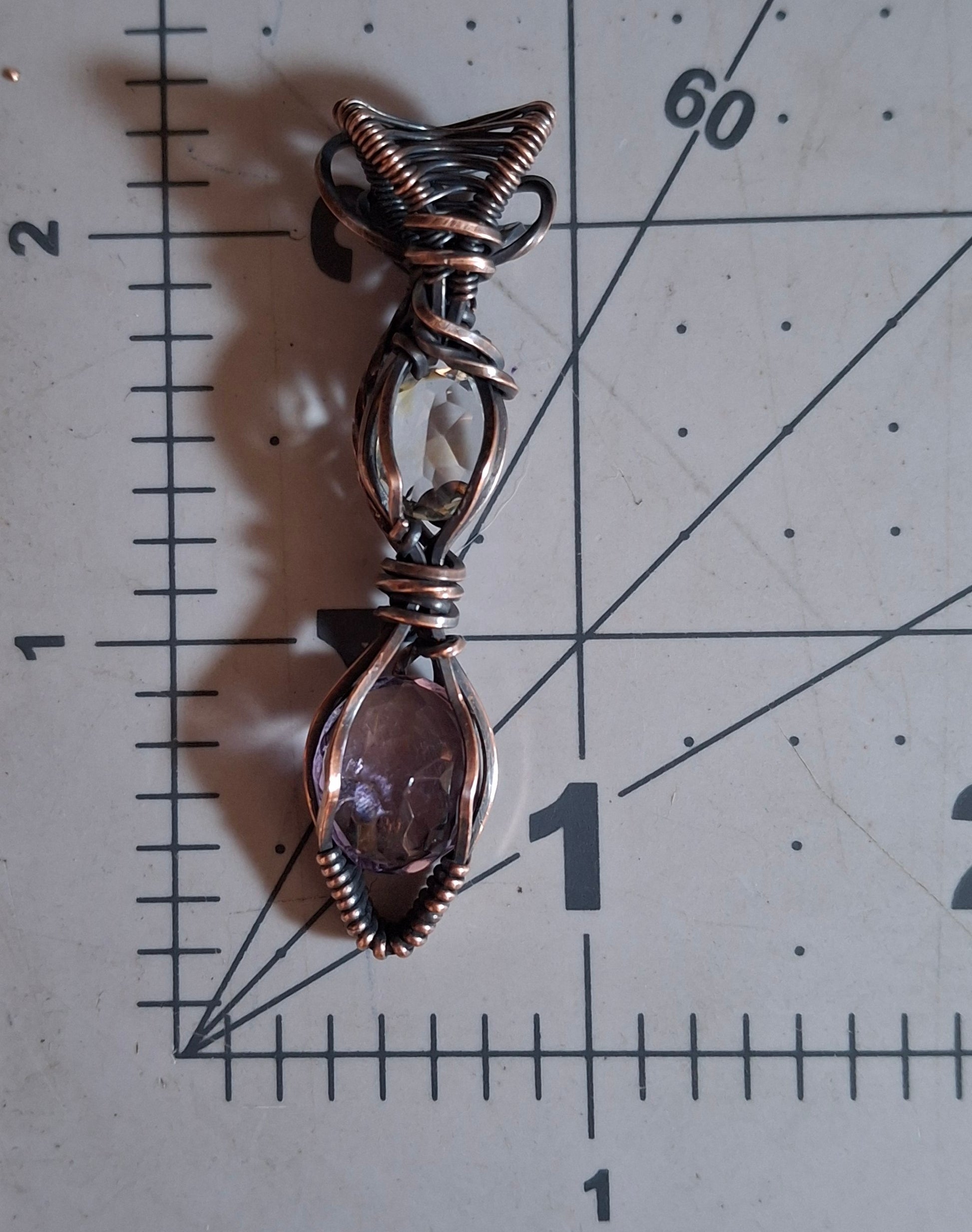 Amethyst and clear quartz in oxidized copper. Comes on 18in or 23in faux suede cord. Size reference in photos