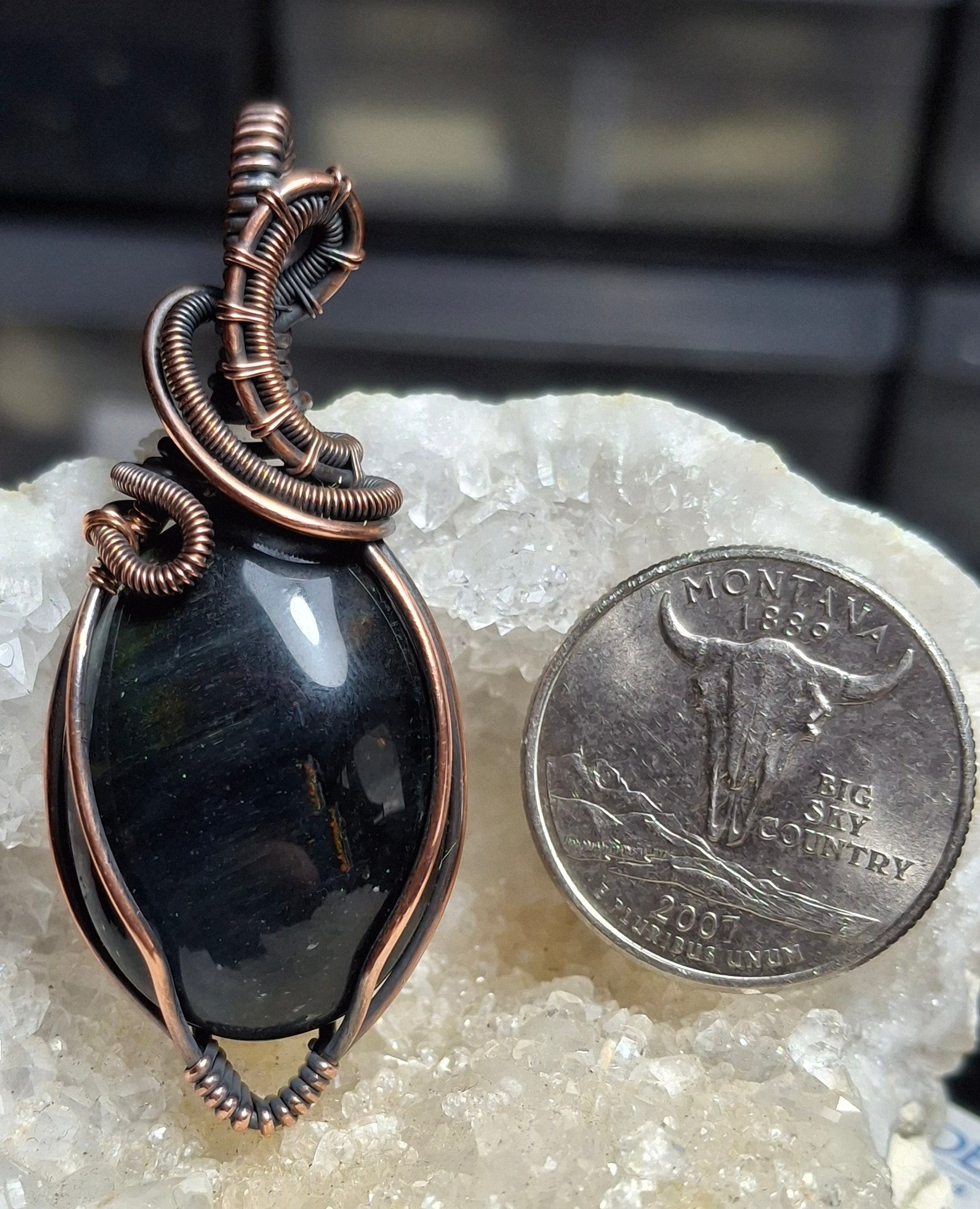 Blue Tigers eye in oxidized copper. Comes on 18in or 23in faux suede cord. Size reference in photos