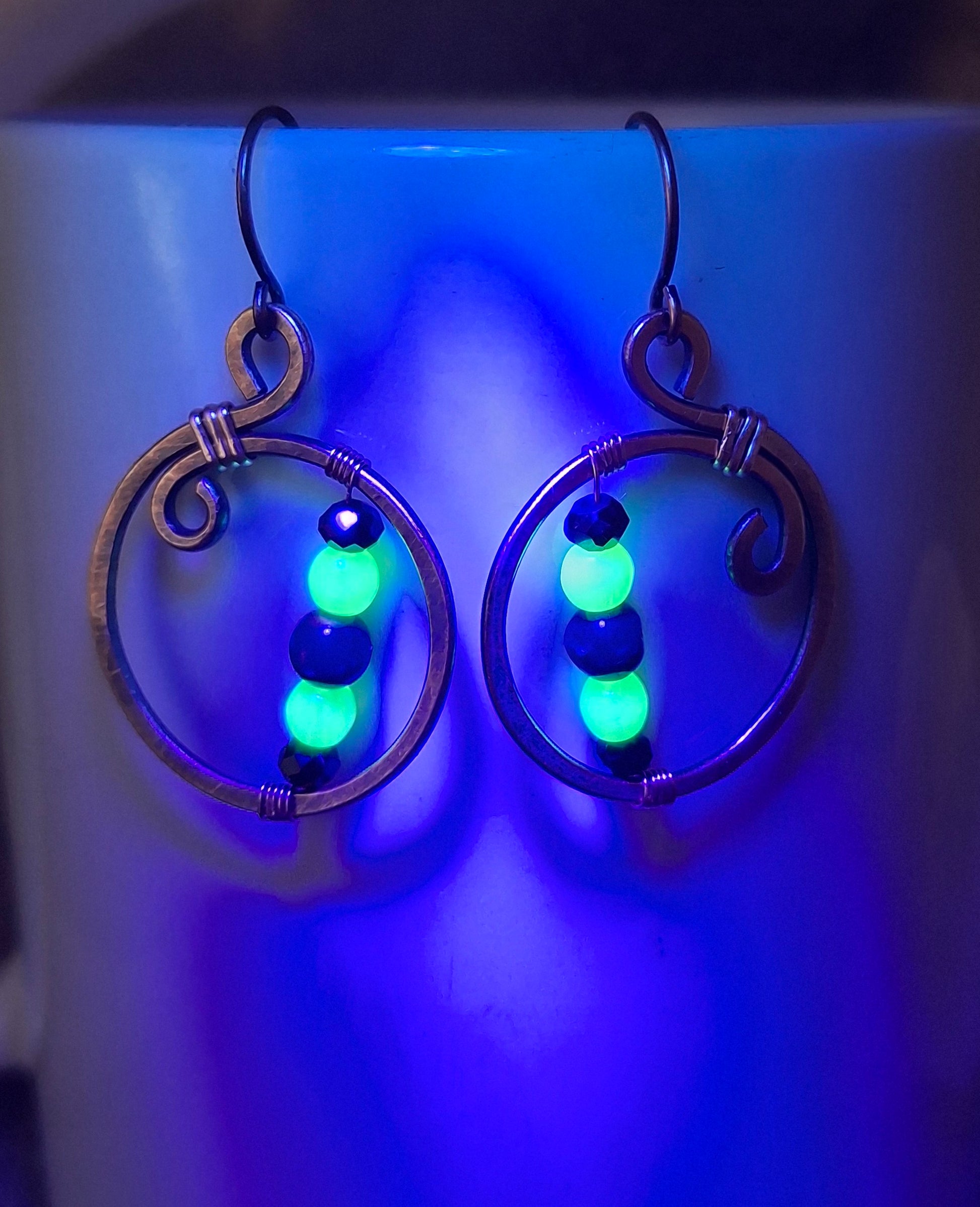 Uranium glass, black spinel, and smoked opal in oxidized copper. Comes on copper hooks, message me if you need stainless steel instead